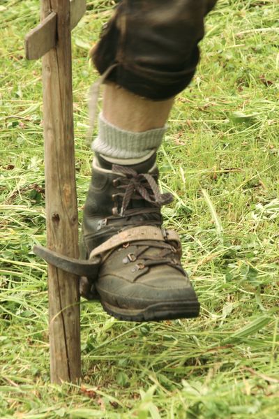 Anschließend kam der Huizetreatar zum Einsatz. Es ist ein Gerät aus Eisen, das an der Außenseite des Schuhs angeschnallt wird und mit dem der Huize dann ganz einfach in den Boden getrieben wurde.