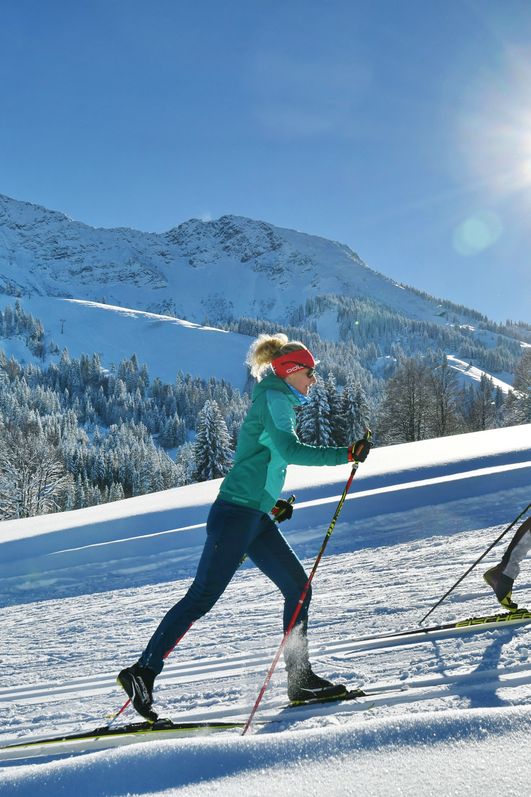 Der Langlaufski gleitet leicht durch den weißen Schnee und hinterlässt eine schmale Spur in der frisch präparierten Loipe. Euer Blick schweift in die Weite, die Loipe führt mitten in die Berge und am Rand glitzert der Neuschnee im Sonnenschein. Es geht leicht bergauf, Eure Schritte werden kürzer. Die klare, kalte Winterluft füllt Eure Lungen und zieht Euch förmlich den Hügel hinauf. Die Abfahrt kommt – kurz die Beine entspannen, dann geht es mit kräftigen Schwüngen weiter in die traumhafte Winterlandschaft hinein.